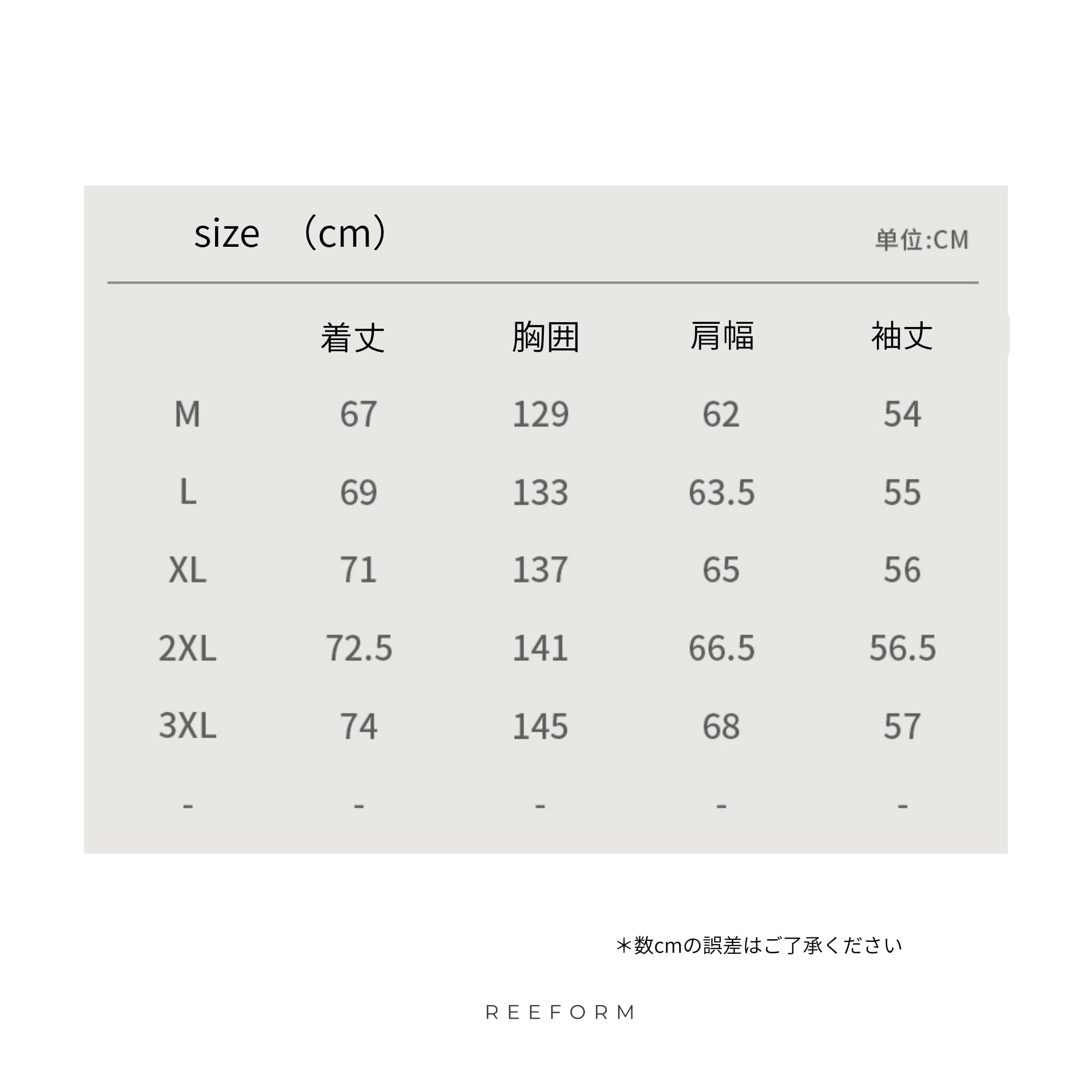 3XL:着丈74 / 胸囲145 / 肩幅68 / 袖丈57