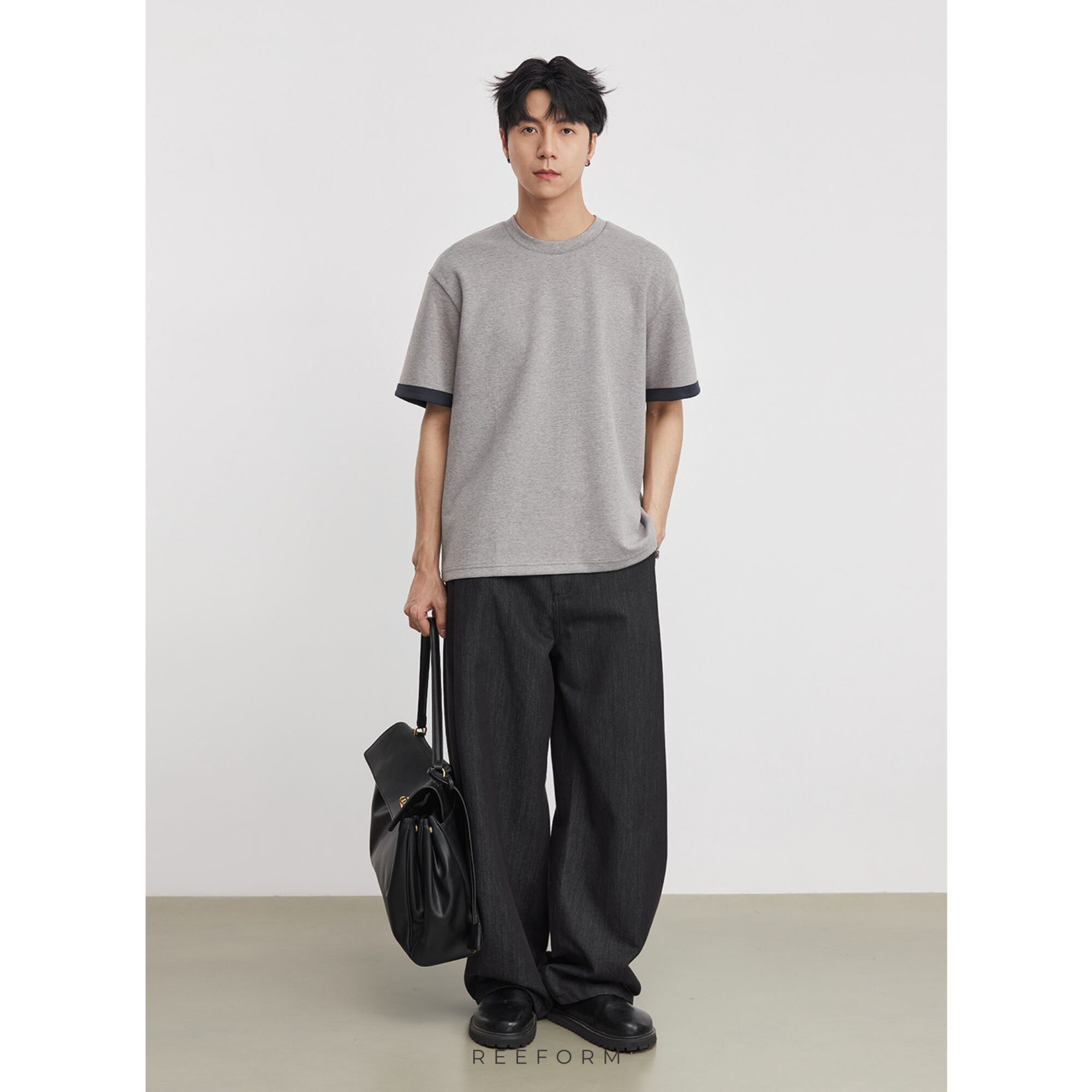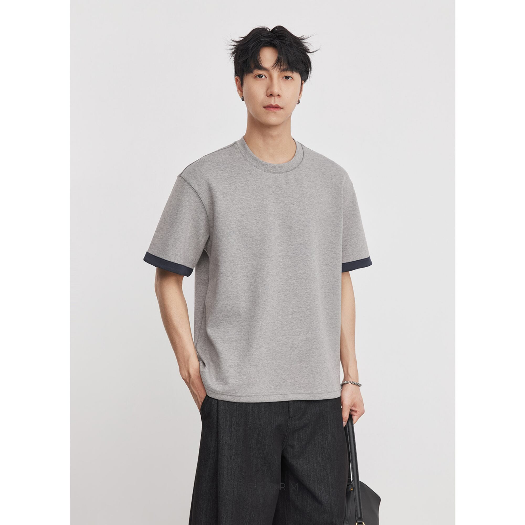 カラーブロック クルーネック 半袖 夏 メンズ カジュアル ルーズ Tシャツ ベースレイヤー/ グレー RF-26SP-059
